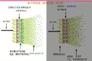 去除室内颗粒污染物的工作原理类似,都是通过使空气中的颗粒物带电,聚结形成较大颗粒而沉降,但颗粒物实际上并未移除,只是附着于附近的表面上,易导致再次扬尘。空气中人肉眼无法看到的2.5微米(PM2.5)的浮沉对人体的危害是最大的,可以进入肺的深部,直接进入肺泡,在血液流经肺部进行气体交换时直接进入血液,小粒径的负氧离子可以与空气中的污染物相互作用、复合、扩散而影响污染物的变换,或作为催化剂在化学过程中改变痕量气体的毒性。小至0.01微米、在工业上难以除去的的微粒飘尘,亦有明显的沉降去除效果。